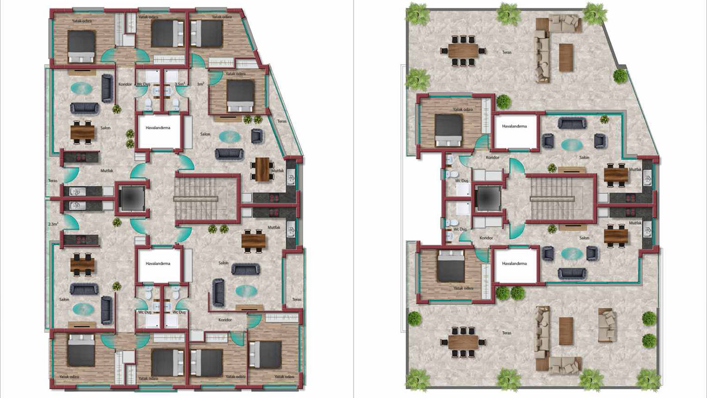 Geniş yaşam alanları, geniş balkonlar teraslarla konforlu bir yaşam sunar.